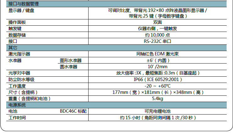 ● ES-52 所具有的編碼器能夠保證在持續(xù)測(cè)量條件下角度的可靠性。雙軸補(bǔ)償器能夠保證儀器在地形惡劣的環(huán)境下仍精確水平